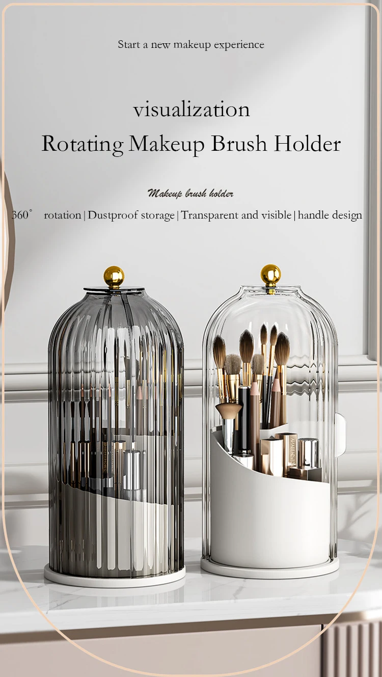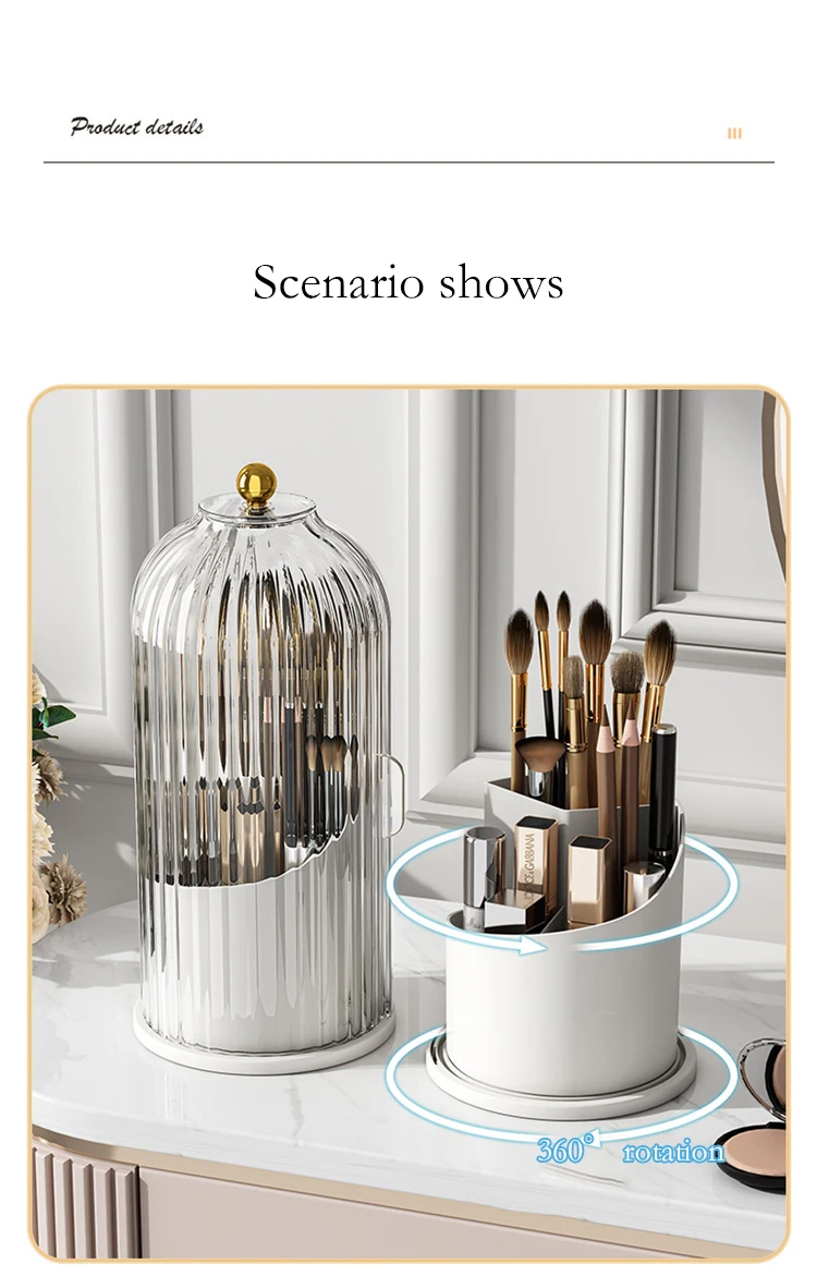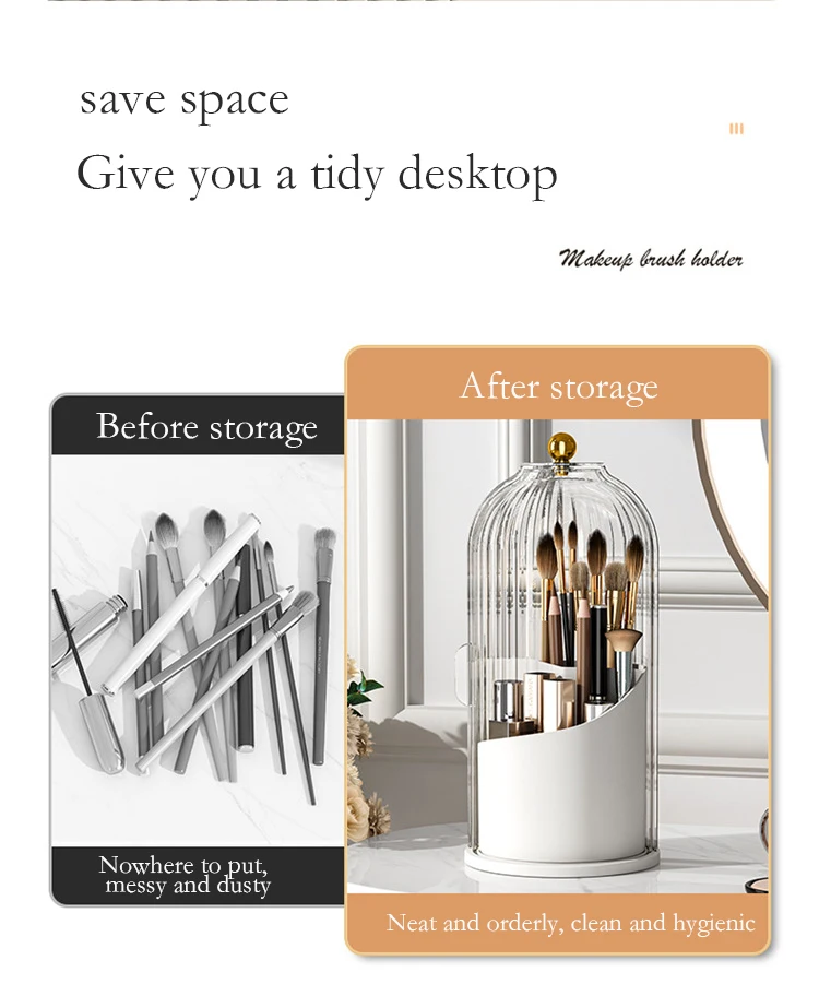 "I recently purchased the 360° rotating storage box and I'm extremely satisfied with it. The PS material makes it both durable and stylish, and the rotating feature is a game-changer for accessing my makeup easily. The cover keeps everything waterproof and dustproof, while the transparent design lets me see all my items at a glance. It’s compact size saves a lot of space on my counter, freeing up room for other essentials."